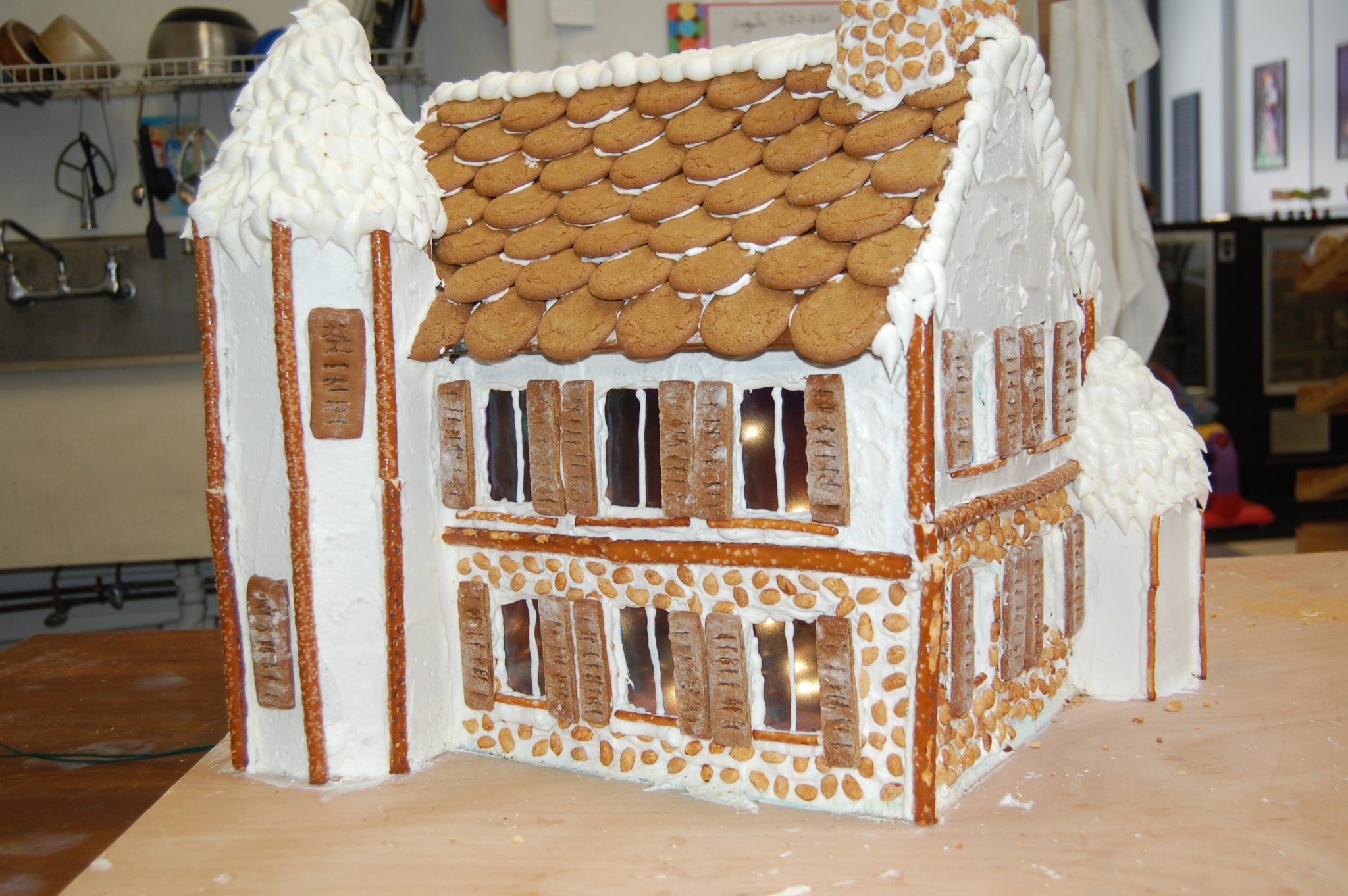 This is truly the most amazing gingerbread house I have ever seen. The stonework, the windows, the icicles, all looks like the work of someone with years of gingerbread construction experience, however, amazingly this is the first gingerbread house ever made by the Cake Man in Mathews. Not bad for his first try! Of course, this picture does not do it justice, you have to see it for yourself to believe how intricate the work is.